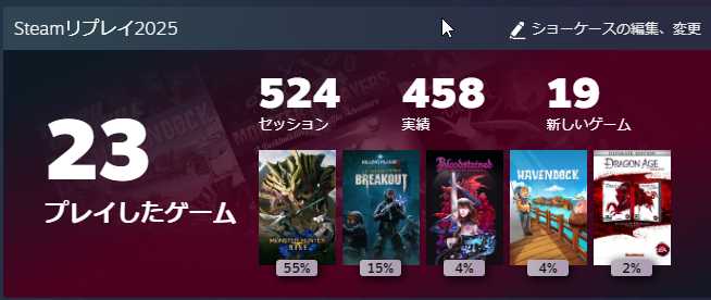 結局ダークソウル3やれてないからね。去年の2025展望かどこかで来年はダクソ3やるぞって宣言してたのに完全に計画が狂ってしまった。実際半年くらいはモンハン中心にちょっと軽めのゲームを合間に挟むかって感じだったんでRPGとか大型ストラテジーには一切手が付けられていない。Witcher3とか未だに積んでる。アレ確か軽く100時間超のボリュームって聞いてるし、正直スタートラインに立つのにだいぶ気力を振り絞る必要がありそう。